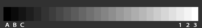 For best results when viewing photographs on our website, please adjust your monitor so that you are able to distinguish as many of the 26 gray-level steps below as is possible. Particularly, pay close attention to steps A,B,C, and 1,2,3. Tip: If steps A through C and 1 through 3 show no separation, lower your monitor's contrast, and if A through C or 1 through 3 are not defined, raise or lower your monitor's brightness.
